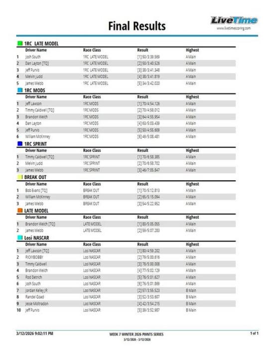 RACE RESULTS FOR WEEK 7 (FINAL WEEK) OF WINTER 2026 POINTS SERIES