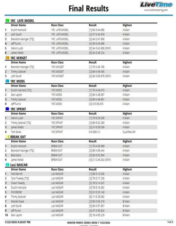 RACE RESULTS FOR FINAL WEEK OF WINTER 25/26 POINTS SERIES